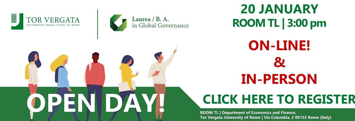 The Tor Vergata University of Rome offers the 3-year interdisciplinary (L-16-R, Political Sciences) Undergraduate Degree (B.A.) in Global Governance taught in English. The extraordinary innovation of this Liberal Arts and Sciences course, within the Italian educational system, is in its inter-disciplinary nature, embracing courses from all the fields of study offered by the Tor Vergata University of Rome: Arts and Humanities, Economics, Engineering, Law, Medicine and Sciences. Distinguished local and international visiting professors from the above-mentioned areas have agreed to offer an unusual combination of courses meant to rigorously raise the awareness of young students to the challenges of global phenomena and their appropriate governance. This course will be reserved to a limited number of students, coming from all over the world, holding a high school diploma.