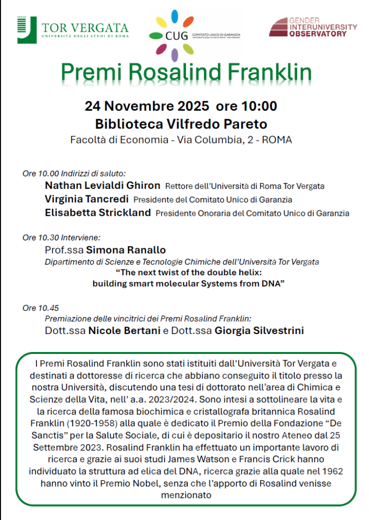 La mattinata inizierà alle ore 10:00 con gli indirizzi di saluto del Rettore dell'Università di Roma Tor Vergata, Nathan Levialdi Ghiron, della Presidente e della Presidente Onoraria del Comitato Unico di Garanzia, Virginia Tancredi ed Elisabetta Strickland. Alle ore 10:30, la Prof.ssa Simona Ranallo del Dipartimento di Scienze e Tecnologie Chimiche terrà una relazione dal titolo: “The next twist of the double helix: building smart molecular Systems from DNA”, che farà da stimolante preludio alla premiazione. Le vincitrici di questa prima edizione sono la Dott.ssa Nicole Bertani e la Dott.ssa Giorgia Silvestrini.