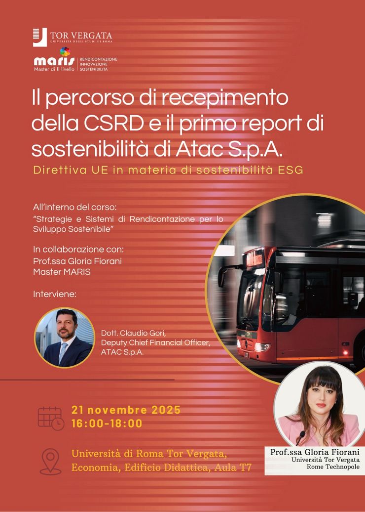 Penultimo appuntamento del ciclo di seminari “Le aziende si raccontano. Storie di sostenibilità e opportunità per i giovani”. In compagnia del Dott. Claudio Gori, Deputy Chief Financial Officer di ATAC SpA, sarà possibile ripercorrere la strada che l'agenzia del trasporto autoferrotranviario del Comune di Roma ha compiuto nella redazione della dichiarazione non finanziaria.