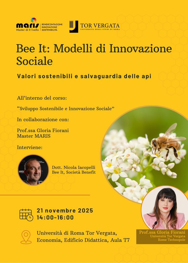 Attraverso la testimonianza del Dott. Nicola Iacopelli, entreremo nel mondo di Bee It, Società Benefit che si impegna ogni giorno nella salvaguardia delle api. L'intervento si inserisce nell'ambito del corso "Sviluppo Sostenibile e Innovazione Sociale" e si svolge in collaborazione con il Master MARIS - Master di II livello in Rendicontazione Innovazione Sostenibilità.