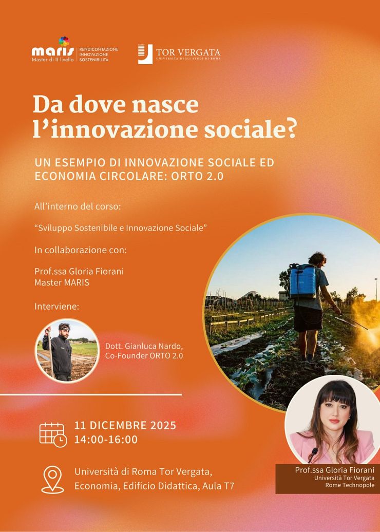 La testimonianza, promossa nell'ambito del corso "Sviluppo Sostenibile e Innovazione Sociale" (Prof.ssa Gloria Fiorani), si svolgerà in collaborazione con il Master di II livello MARIS, Rendicontazione Innovazione Sostenibilità.