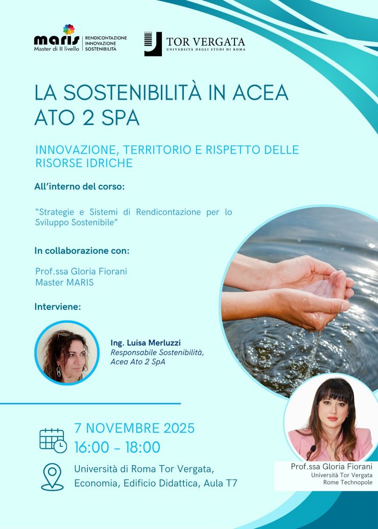 Nell'ambito del ciclo di seminari organizzati all'interno dei corsi "Strategie e Sistemi di Rendicontazione per lo Sviluppo Sostenibile" (titolare insegnamento Prof.ssa Gloria Fiorani), si inserisce il secondo appuntamento che vede protagonista il Gruppo Acea. La testimonianza dell' Ing. Luisa Merluzzi, Responsabile Ufficio Sostenibilità, Acea Ato 2 SpA, rappresenterà un'occasione unica per approfondire le modalità di implementazione delle logiche di sostenibilità all'interno del Gruppo.