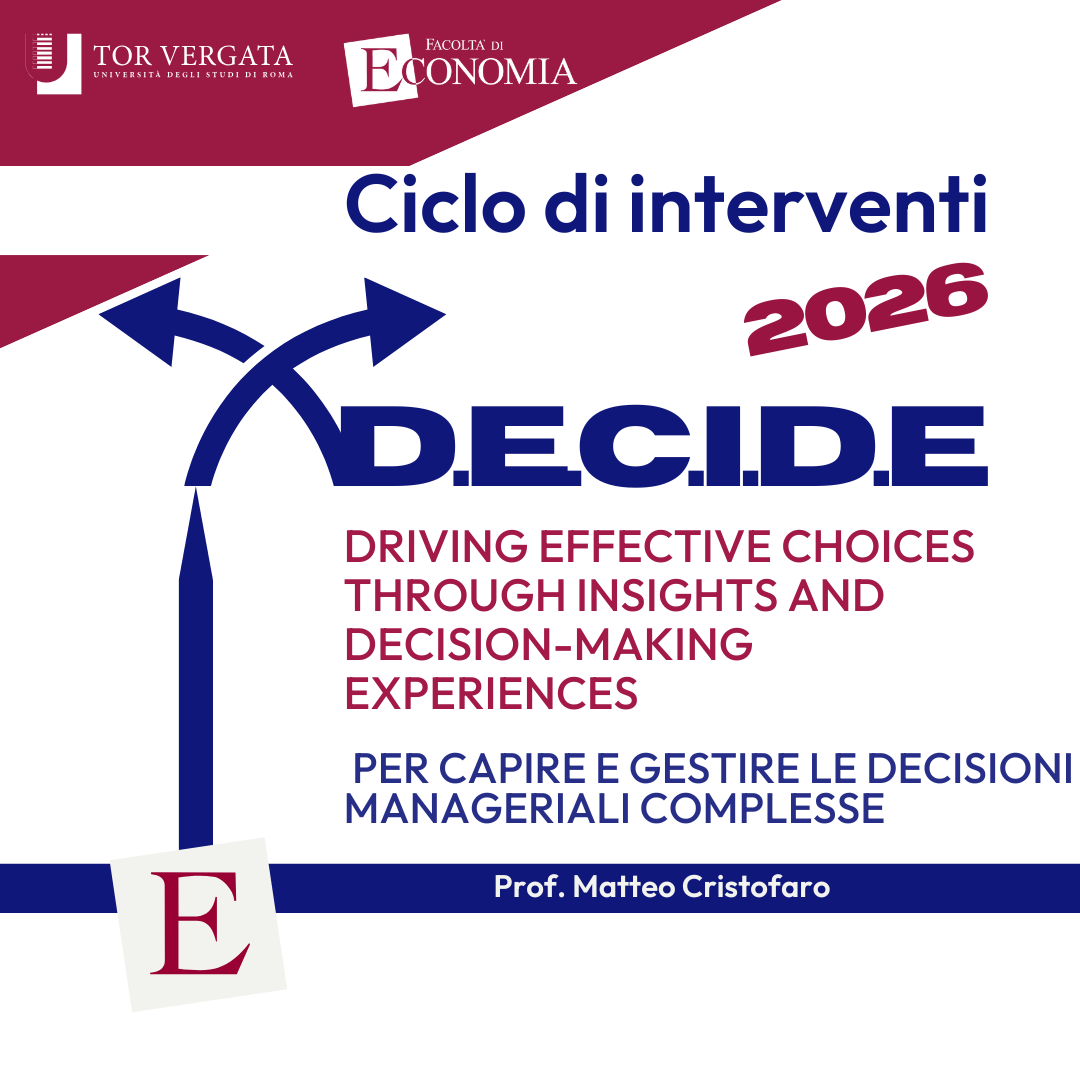 Riprende da marzo D.E.C.I.D.E., il ciclo di appuntamenti coordinati dal Prof. Matteo Cristofaro del Dipartimento di Management e Diritto, dedicato a tutti gli studenti interessati ad approfondire come si costruiscono e si governano le decisioni manageriali. La nuova edizione amplia e rafforza l’approccio esperienziale, mettendo al centro il confronto diretto con professionisti, manager e leader d’impresa.