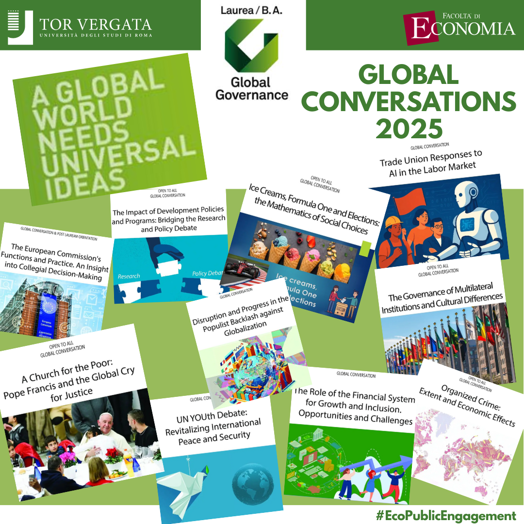 Dalla geopolitica all’innovazione, dal lavoro alla sostenibilità: Global Conversations è un ciclo di incontri, seminari e workshop organizzato all’interno del Corso di laurea in Global Governance, coordinato dal Prof. Gustavo Piga del Dipartimento di Economia e Finanza.
