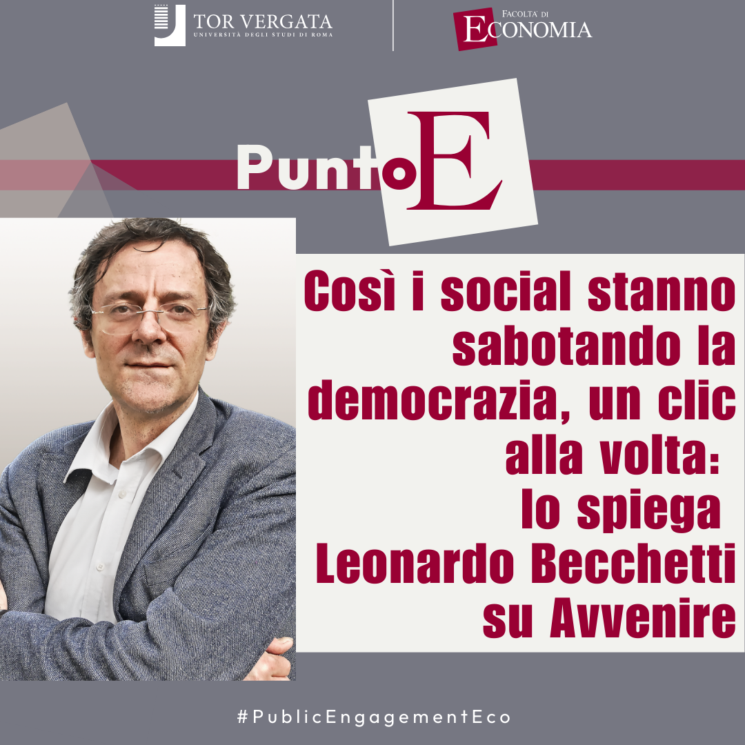 Nel suo articolo su Avvenire dell'11 febbraio 2026, il Prof. Leonardo Becchetti del Dipartimento di Economia e Finanza sostiene che i social network, attraverso i loro algoritmi di engagement, stanno lentamente compromettendo la democrazia. I meccanismi alla base delle piattaforme digitali privilegiano infatti contenuti che generano reazioni rapide e intense, come rabbia, conflitto e polarizzazione, dal momento che questi massimizzano il tempo di permanenza degli utenti e quindi i profitti pubblicitari.