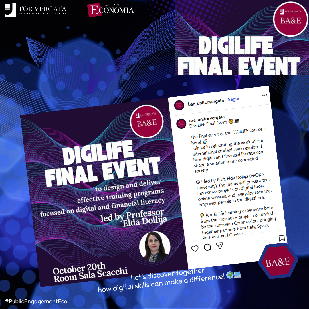 “L'appuntamento finale di DIGILIFE ha ricevuto un consenso pressoché unanime da parte degli over 65 che abbiamo accolto nelle nostre aule, soprattutto grazie all'entusiamo e alla dedizione dei nostri studenti BA&E che si sono impegnati 'sul campo' per realizzare una vera e propria 'staffetta generazionale' tecnologicamente parlando, trasferendo in modo semplice e coinvolgente competenze digitali ai senior presenti con lo scopo di formare, informare e sensibilizzare - ha commentato il Prof. Gianluca Mattarocci, promotore del progetto - Durante l'evento sono state organizzate varie sessioni di lavoro su temi di grande attualità, spaziando dal digitale in senso stretto a applicativi legati al mondo dell'Economia (google maps, online banking, movit, google suite, assistenti vocali, app su vita sana, ecc.). L’iniziativa, coordinata da Elda Dollija (EPOKA University e docente presso il BA&E), ha così riscosso grande successo tra i partecipanti, che hanno apprezzato la disponibilità e la serietà dei ragazzi coinvolti. Una bella esperienza che ha rafforzato il dialogo tra generazioni e ha permesso, al tempo stesso, ai nostri giovani di acquisire soft skills preziose per il loro futuro personale e professionale”.